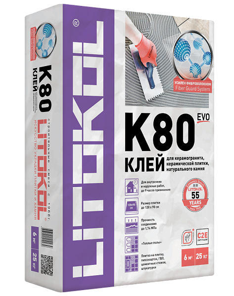 Клей, усиленный фиброволокном, для плитки, керамогранита и камня LITOFLEX K80 (класс С2 E)